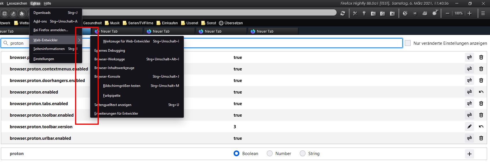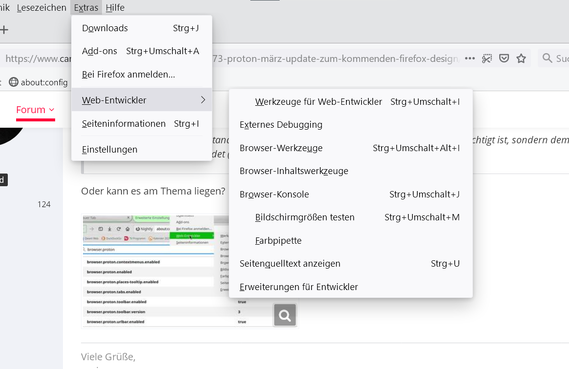 Mit browser.proton.appmenu.enabled gibt es den ersten Schalter schon nicht mehr. Dahinter wurde das neue Hauptmenü entwickelt. Dieses wird jetzt über die Haupteinstellung browser.proton.enabled aktiviert. Zwar ist auch dieses noch nicht ganz fertig, wie man an den Zoom-Buttons sieht, aber die Arbeiten daran sind nun so weit fortgeschritten, dass es nun einfacher zugänglich gemacht wird.