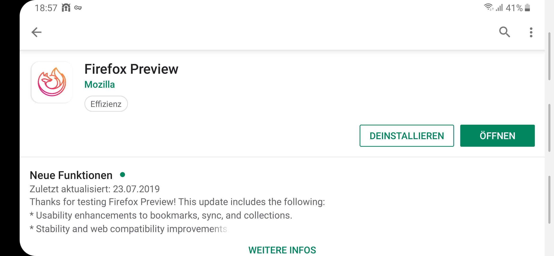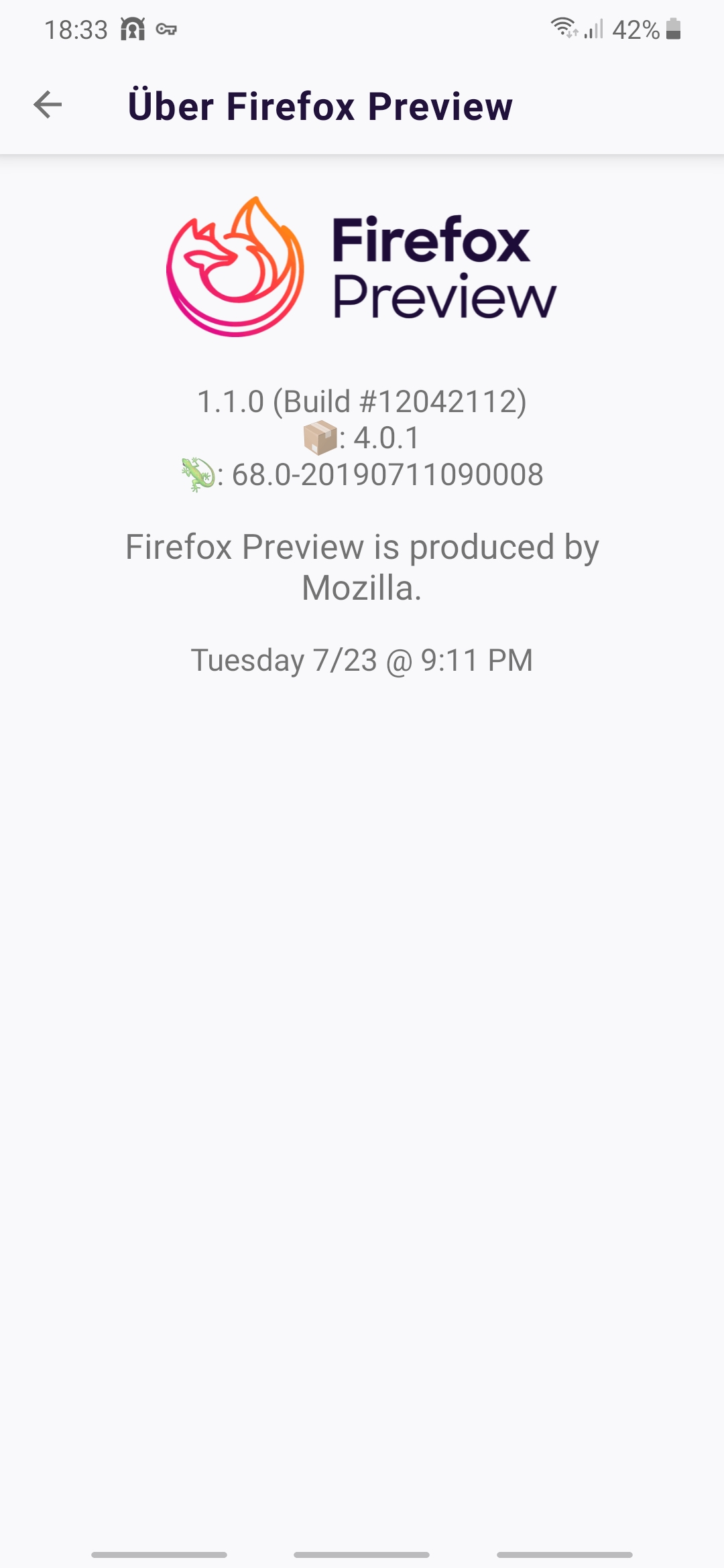 Firefox Preview 1.1 basiert auf den Mozilla Android Components 4.0.1 (vorher: AC 0.56.4) und Mozilla GeckoView 68 2019-07-11 (vorher: GV 68 Beta 2019-06-11).