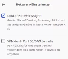 Die Netzwerkeinstellungen zum Tunneln des VPNs durch Port 53 sowie für den lokalen Netzwerkzugriff wurden entfernt.