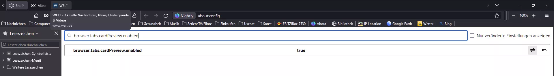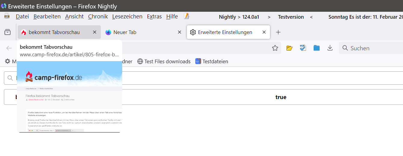 Die Funktion kann ab Firefox 123 über about:config aktiviert werden, indem der Schalter browser.tabs.cardPreview.enabled per Doppelklick auf true gesetzt wird. Allerdings ist zu beachten, dass die Arbeiten an der Funktion noch nicht komplett abgeschlossen sind und daher für die finale Version von Firefox 123 auch noch keine standardmäßige Aktivierung geplant ist.