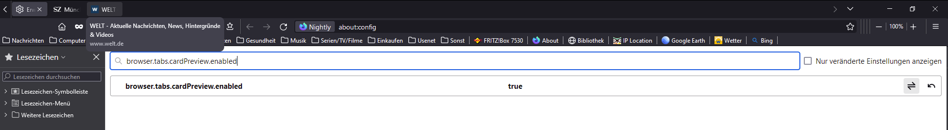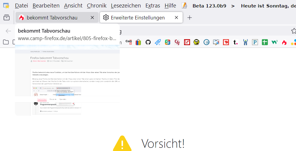Wird zusätzlich der Schalter browser.tabs.cardPreview.showThumbnails auf false gesetzt, können die neuen Tooltips ohne Vorschaubilder genutzt werden. Der Schalter browser.tabs.cardPreview.delayMs kontrolliert die Verzögerung, wann der Tooltip gezeigt werden soll. Standardmäßig steht diese Option auf 1000 (Millisekunden), sodass der Tooltip erst erscheint, nachdem man wenigstens eine Sekunde mit der Maus auf dem Tab war.