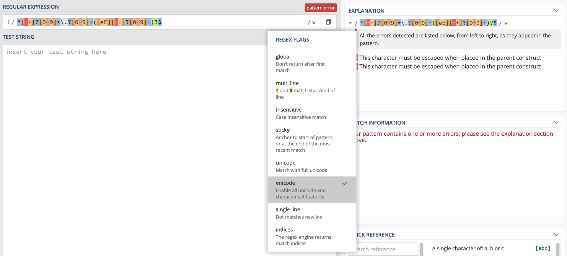 The pattern's regular expression is compiled with the 'v' flag. This makes the regular expression unicode-aware, and also changes how character classes are interpreted. This allows character class set intersection and subtraction operations, and in addition to ] and \, the following characters must be escaped using a \ backslash if they represent literal characters: (, ), [, {, }, /, -, |.