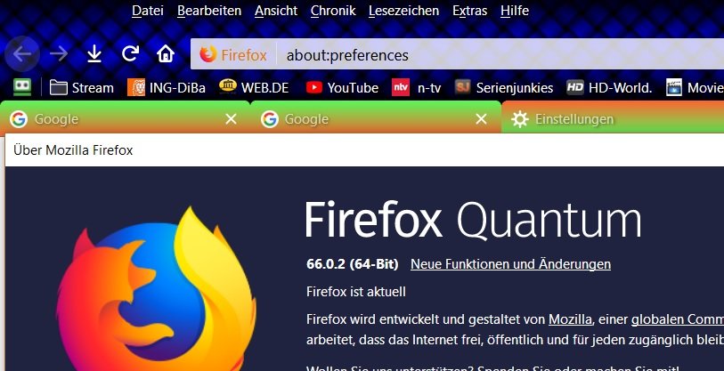 Sieht grundsätzlich auch nicht schlecht aus, weiss nur nicht wie ich die Tabs wieder unter die Lesezeichenleiste kriege und färbe...