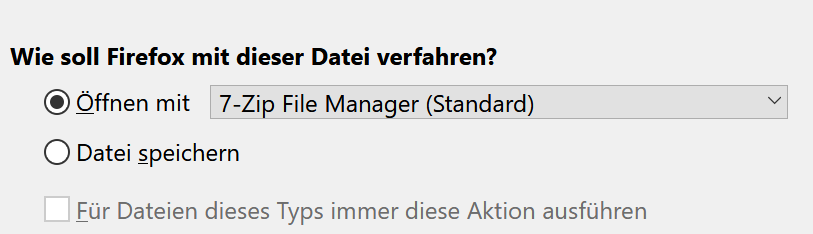 FF erkennt 7zip als zuständiges Programm, aber in den Einstellungen sehe ich 7zip nicht..