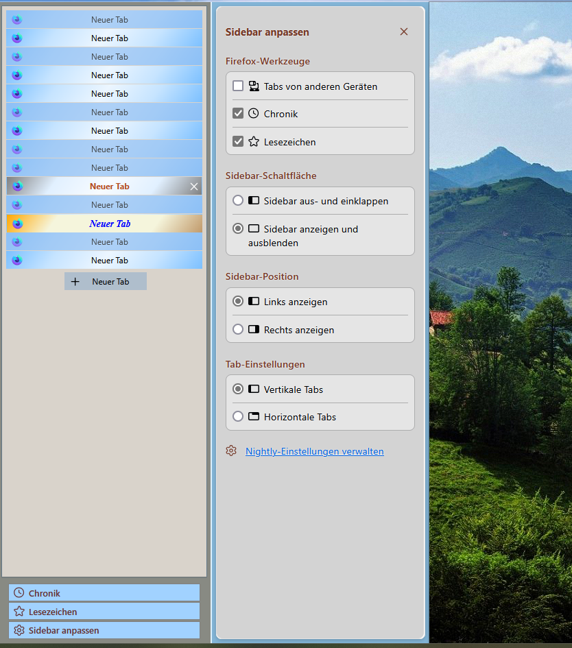 Es liegt doch an Nightly, wenn das sidebar.revamp auf true gestellt wird, dann ist es so, wie auf meinen Bildern oben dargestellt.