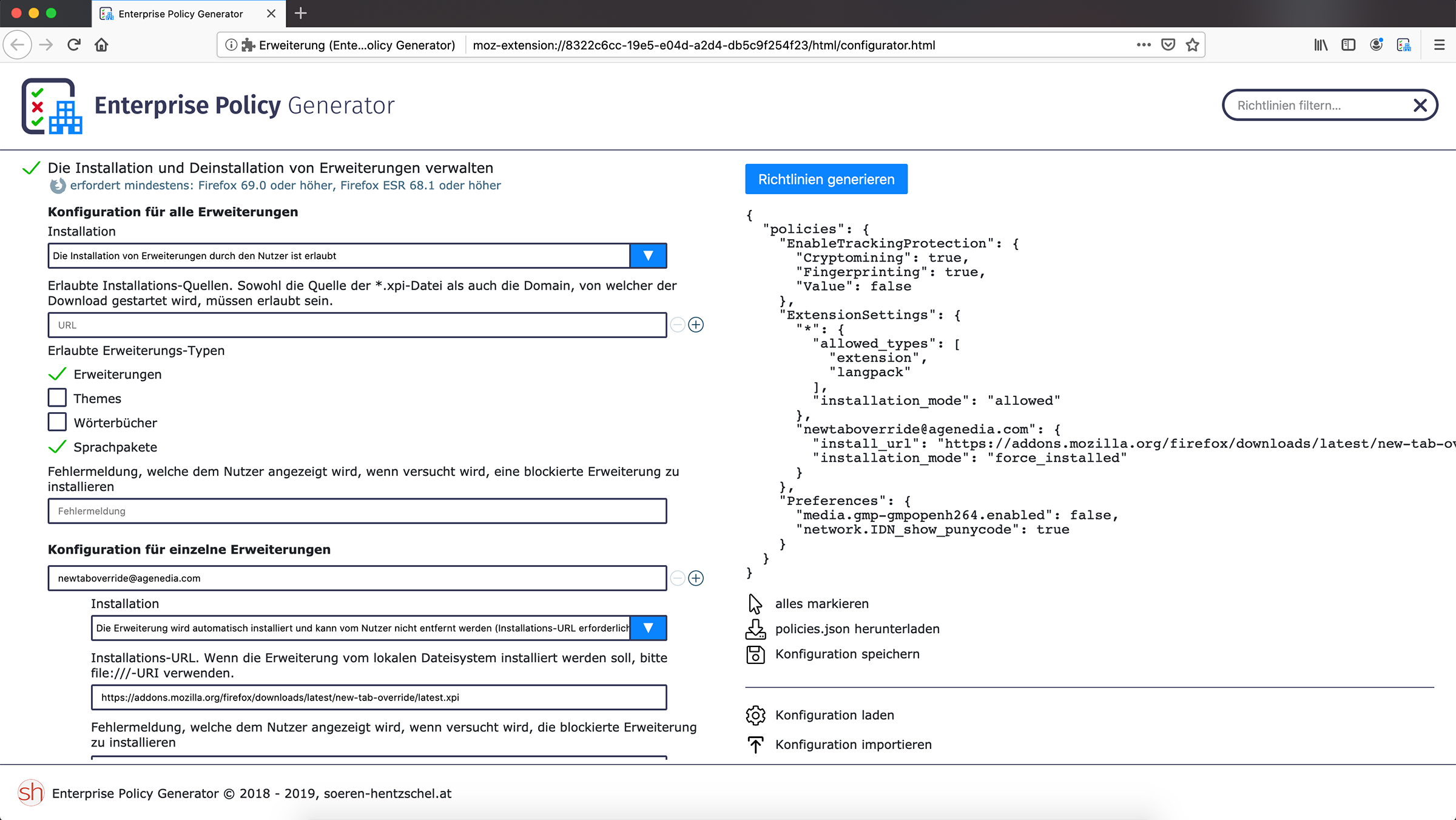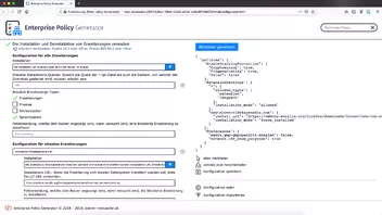Ab Firefox 69 / Firefox ESR 68.1 gibt es eine neue Policy für die Installation von Erweiterungen (ExtensionSettings). Die alte Policy (Extensions) sollte weiterhin funktionieren, ich würde aber empfehlen, auf die neue Policy umzusteigen. Falls du meine Erweiterung Enterprise Policy Generator nutzt, da sollte heute Nacht oder morgen Abend Version 5.0 erscheinen, welche die neue Policy unterstützt.