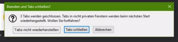 Beim Beenden des FF kam wie gewünscht die Meldung, dass die Tabs wiederhergestellt werden. Ich bin mir ziemlich sicher, dass es früher mal eine dritte Option - neben Tabs schließen und Abbrechen - gab. Nämlich die des nicht-speicherns. Ich möchte nämlich grundlegend immer alle Tabs wiederherstellen, aber die Tabs auch bei Bedarf alle schließen ohne das die wiederherstellt werden. (s. Bild 2) Das klingt zwar widersprüchlich, aber hin und wieder kommt es zu einem dieser Fälle, dass ich die Session mit allen Tabs am morgen wieder haben will und am darauffolgenden eben nicht mehr.
