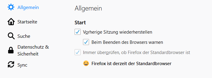 Ich habe die Einstellung im Firefox vorgenommen, die meine Tabs speichert, wenn ich noch mehr als eine offen habe und den FF beende. (s. Bild 1)