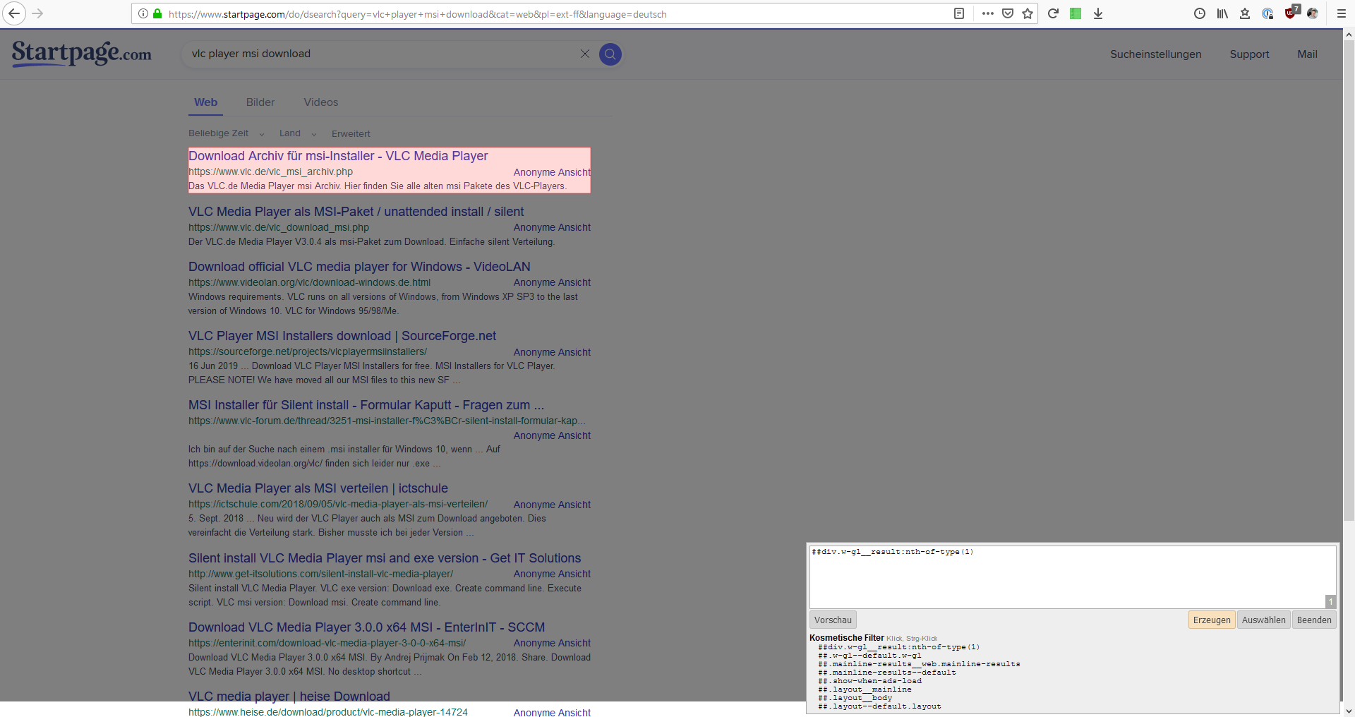 kann ich mit uBlock Origin bestimmte URL's im Vorfeld entfernen? Hier zum Beispiel die gefälschte Seite vlc.de der originale Seite videolan.org -> Ich möchte die erst gar nicht in meinen Suchergebnissen haben. Wenn das klappt könnte ich alle weiteren Ad-Sites hinzufügen. Danke!