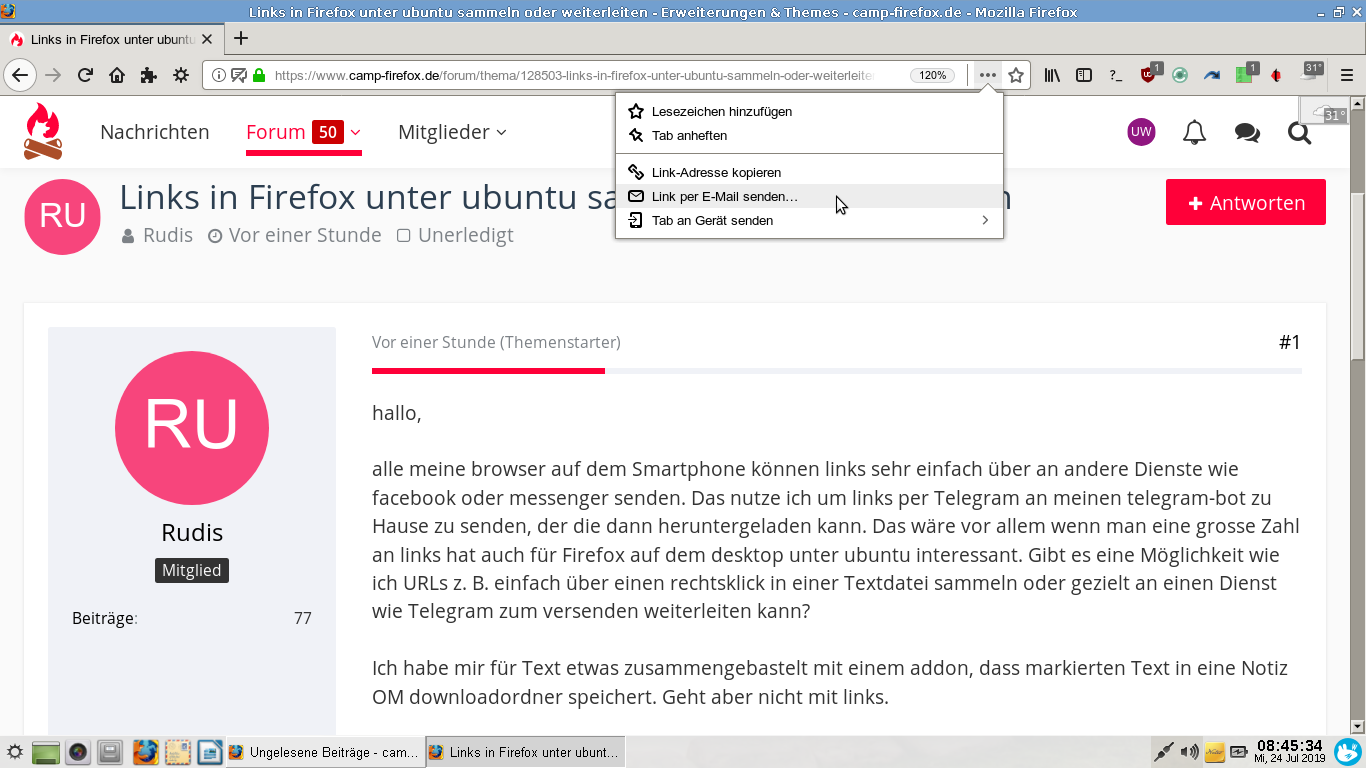 Von Haus aus kannst du Links per Mail versenden (siehe Screenshot), per Add-On aber auch an andere Dienste: https://addons.mozilla.org/de/firefox/sea…e&appver=68.0.1