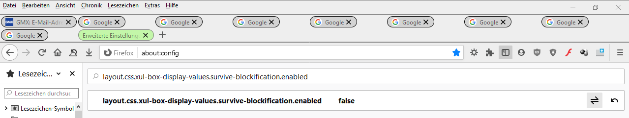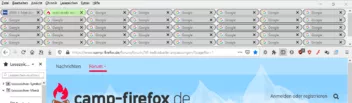 Hallo zusammen, ich habe folgendes extrem nervendes Problem: Ich habe immer um die 40 Tabs oder mehr geöffnet. "Letzte Sitzung wieder herstellen" ist aktiviert. Schließe ich während einer Sitzung dann verschiedene Tabs, die ich z. B. nicht mehr benötige, werden diese beim nächsten Start zusätzlich zu den Tabs der letzten Sitzung ebenfalls geöffnet. Schließe ich diese wieder und starte FF neu, passiert das ganze wieder...egal, ob FF von mir geschlossen wird oder abgestürzt ist. Beispiel (unabhängig von der Menge der Tabs): Habe ich z. B. GMX, google und 2 x ebay geöffnet und ich schließe GMX und 1 x ebay, habe ich beim nächsten Start 1 x google, 3 x ebay und 2 x gmx geöffnet. Erst nach dem ca. 10ten Mal schließen und wieder starten der tabs und von FF verschwinden diese zu viel geöffneten Tabs. Außerdem sollte er beim nächsten Start als ersten Tab GMX öffnen, vorher wird seit neustem immer google vorgeschoben und GMX als 2. Tab geöffnet. Cache und Cookies habe ich schon gelöscht - keine Änderung. Installierte Add-Ons deaktiviert, nicht benötigte deinstalliert - keine Änderung. Angleichungen über Java-Script und CSS: Doppelklick auf Tab = Tab neu laden, Tabreihen mehrzeilig mit Scrollbalken, Farben und Formen der Tabs abgeändert, Fabrbige Symbole im Lesezeichenmenü. Funktioniert alles einwandfrei... Jemand eine Idee? Ich wäre sehr dankbar. BTW.: Das alles passiert erst seit FF 90.00...