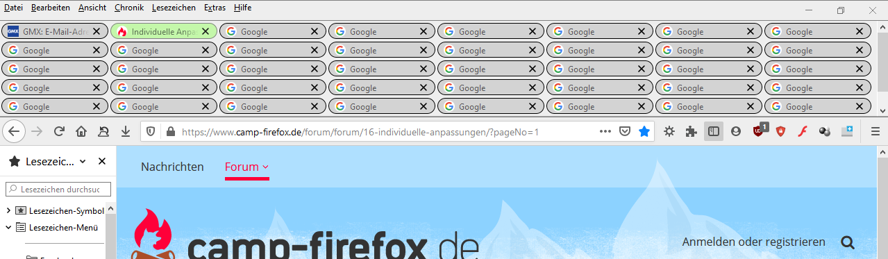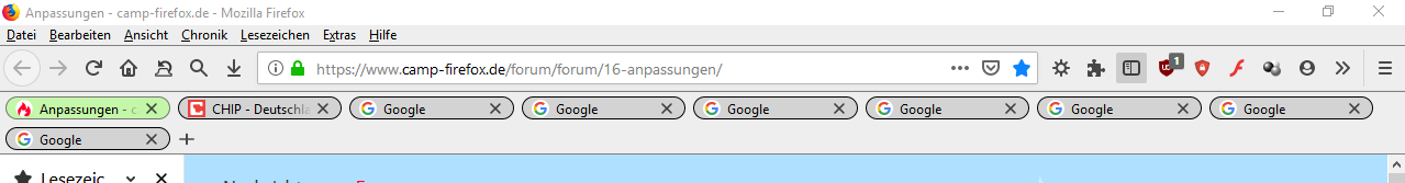 Hallo zusammen, ich klinke mich mal hier rein: Natürlich war auch bei mir nach dem Update auf 71 alles wieder zerschossen (Tabs einreihig, Tabs oben, Tabs zu schmal etc.). jetzt läuft alles wieder, wie es sein soll (Rundungen, Einfärbungen, mehrere Reihen, Scrollbalken), allerdings sind die Tabs wieder "oben"... Kann mir bitte jemand helfen, und mir einen userChrome.css-Eintrag verraten, den ich unten an meinem Code anhängen kann, der auf die anderen Einträge keine Auswirkung hat, aber die Tabs nach "unten" verschiebt; unter die Navigationszeile? Hab schon einiges probiert (auch ältere Möglichkeiten), bisher ohne Erfolg... Vielleicht müssen ja zusätzlich im vorhandenen Code auch noch Änderungen vorgenommen werden... Auch die Umstellung des schon mehrmals erwähnten Schalters, der eh wieder verschwindet, klappt nicht (es ändert sich nur die Breite einiger Tabs)... Ach ja, und der Doppelklick zum Öffnen eines neuen Tabs in der Tableiste funktioniert auch nicht mehr (ist aber sekundär)...