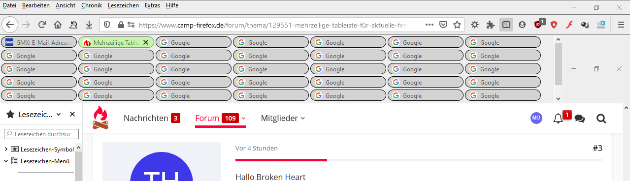 Hallo zusammen, und erst einmal danke für dieses geniale Script von Seite 1. Dieses hat bei mir bis zur FF-Version 107.0 auch reibungslos und fehlerfrei funktioniert. Nach dem Update auf Version 107.0.1 tut es das allerdings nicht mehr, ohne dass ich irgendetwas geändert habe... Das einzige, was noch funktioniert, ist die "Perfekte Abrundung der Tabs". Jetzt sind sie wieder einreihig, schmal, oben und ungewollt hoch. Wie gesagt, bis 107.0 alles i. O. Hat jemand eine Idee? Hat jemand das gleiche Problem? Was wurde in den FF-Settings beim Update geändert und muss vielleicht nur "zurück gestellt" werden, damit alle Einträge im Script wieder "umgesetzt" werden? Hatte FF schon "bereinigt" und den Fehlerbehebungsmodus durchprobiert... Keine Änderung was das Script angeht. Auch die userChrom.css-Einträge hatte ich komplett auskommentiert, ohne Ergebnis in Bezug auf das Script. Bis 107.0 verstanden sich die beiden auch perfekt...