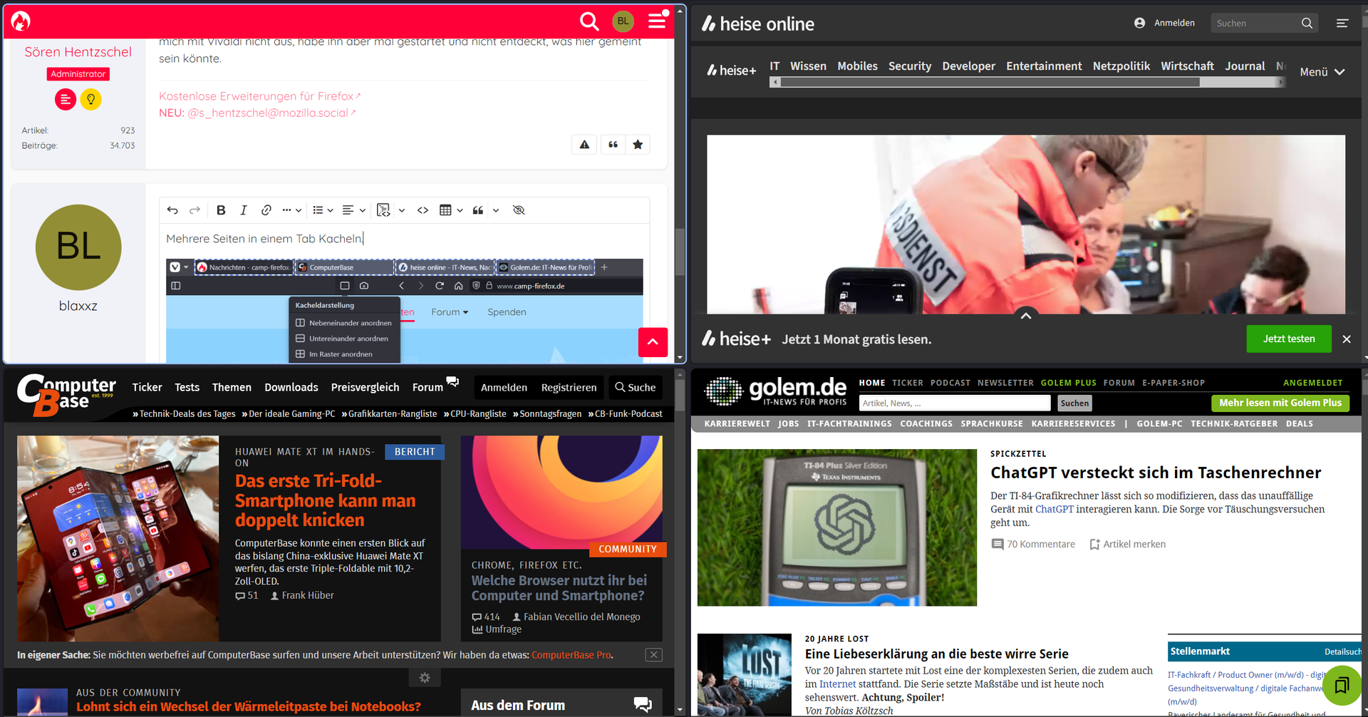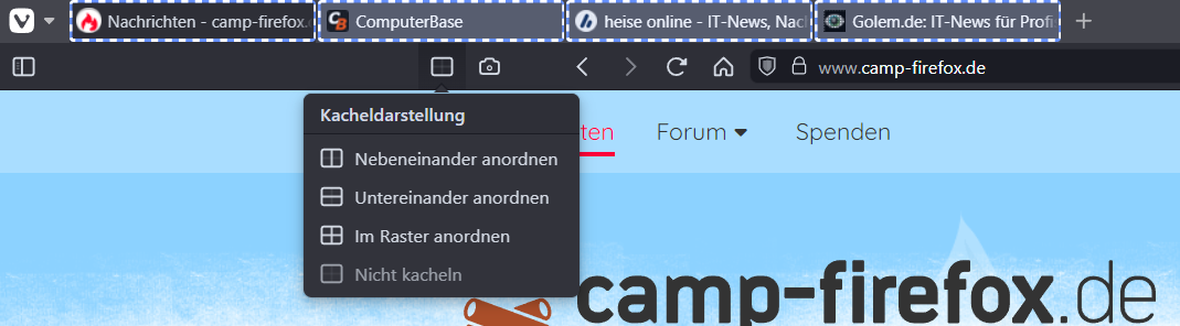 in Vivaldi gibt es eine super Kacheldarstellung von Tabs. Mehrere Tabs in einem Fenster. Ist der einzige Grund, warum ich FF nicht mehr nutze.