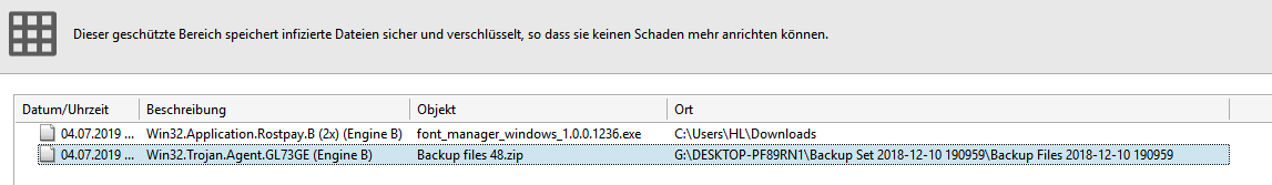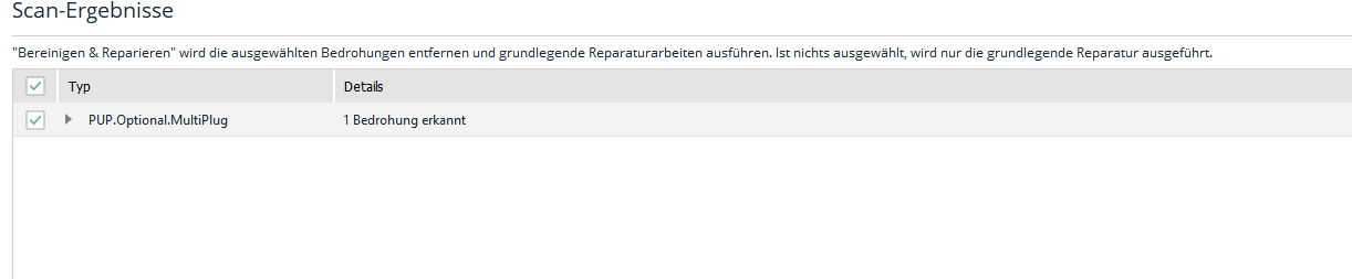 Alles anzeigen# ------------------------------- # Malwarebytes AdwCleaner 7.3.0.0 # ------------------------------- # Build: 04-04-2019 # Database: 2019-06-28.1 (Cloud) # Support: https://www.malwarebytes.com/support # # ------------------------------- # Mode: Scan # ------------------------------- # Start: 07-04-2019 # Duration: 00:00:12 # OS: Windows 10 Home # Scanned: 27557 # Detected: 1 ***** [ Services ] ***** No malicious services found. ***** [ Folders ] ***** PUP.Optional.MultiPlug C:\Program Files (x86)\SAFEMYWEB ***** [ Files ] ***** No malicious files found. ***** [ DLL ] ***** No malicious DLLs found. ***** [ WMI ] ***** No malicious WMI found. ***** [ Shortcuts ] ***** No malicious shortcuts found. ***** [ Tasks ] ***** No malicious tasks found. ***** [ Registry ] ***** No malicious registry entries found. ***** [ Chromium (and derivatives) ] ***** No malicious Chromium entries found. ***** [ Chromium URLs ] ***** No malicious Chromium URLs found. ***** [ Firefox (and derivatives) ] ***** No malicious Firefox entries found. ***** [ Firefox URLs ] ***** No malicious Firefox URLs found. AdwCleaner[S00].txt - [1250 octets] - [26/01/2019 01:42:58] AdwCleaner[S01].txt - [1311 octets] - [07/04/2019 18:31:28] AdwCleaner[S02].txt - [3798 octets] - [16/06/2019 20:34:25] AdwCleaner[C02].txt - [3492 octets] - [16/06/2019 20:34:48] AdwCleaner[S03].txt - [1494 octets] - [04/07/2019 13:00:51] AdwCleaner_Debug.log - [61855 octets] - [04/07/2019 19:54:00] AdwCleaner[S04].txt - [1655 octets] - [04/07/2019 19:54:25] ########## EOF - C:\AdwCleaner\Logs\AdwCleaner[S05].txt ##########Gruß Hans