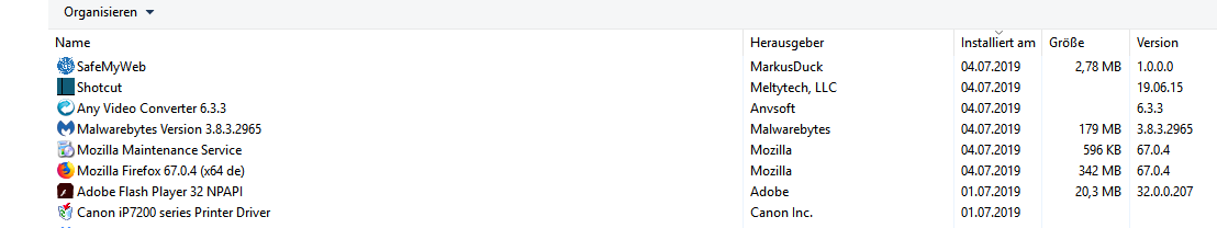 - interessant ist woher die Programminstallation von gestern kommen. Wenn ich den Screenshot von gestern 21:46 (AnhangP1) mit dem von heute 14:38 (Anhang P2) vergleiche. So weiß ich nicht woher savemyweb kommt. Any video-converter hatte ich im Laufe des gestrigen vormittags aktualisiert, hätte also gestern um 21:46 schon angezeigt werden müssen.