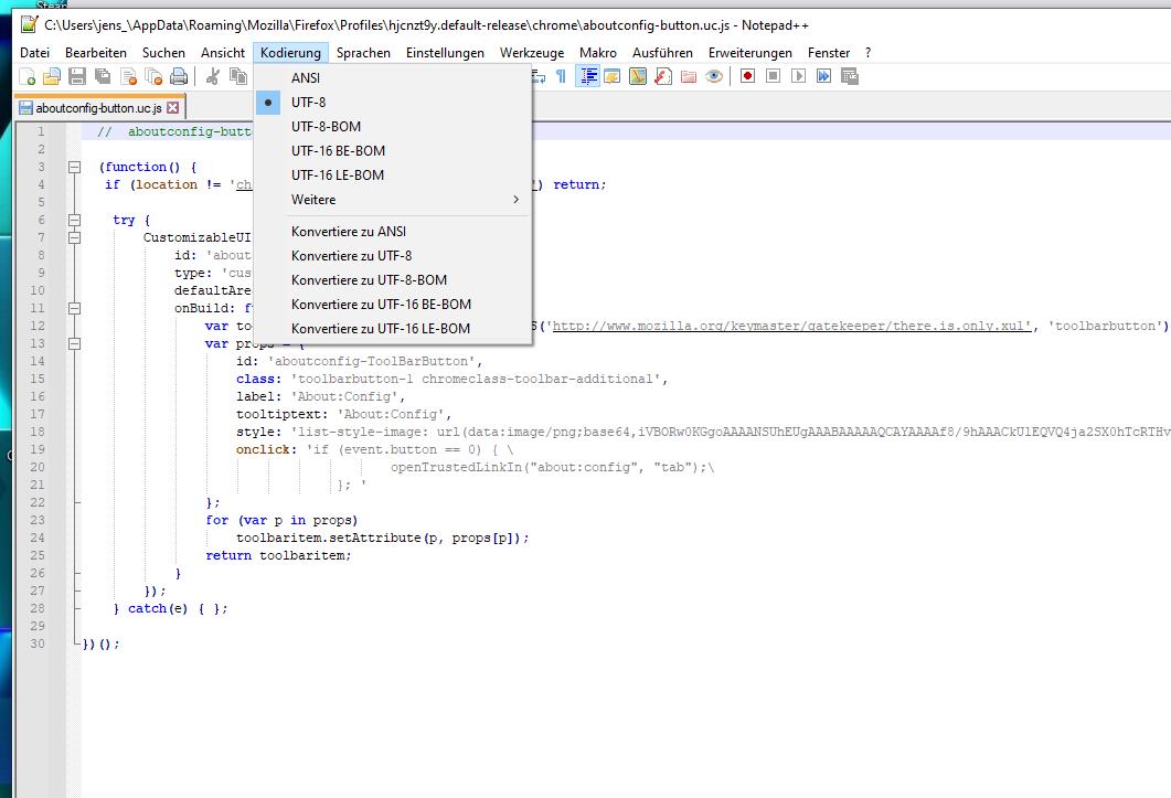 Eintrag der About:Config mit aufzeigen dass es OHNE BOM ist. So ist es bei der 01-MultiRowTabLiteforFx.uc.js auch
