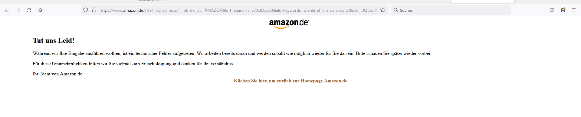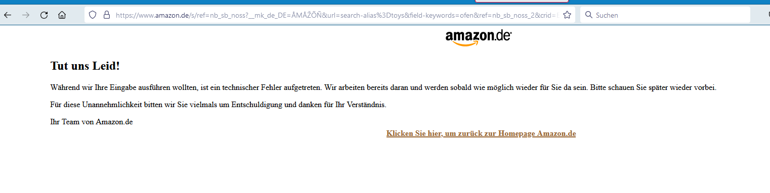 ich hab neuerdings folgendes Problem, bei der Suche in Amazon (offensichtlich nur in FF, probehalber in Edge getestet, dort ist kein Fehler). Egal, was ich als Suchbegriff eingebe (sogar bei keinem Suchbegriff und Klick auf die Lupe), es kommt immer die gleiche Fehlermeldung: