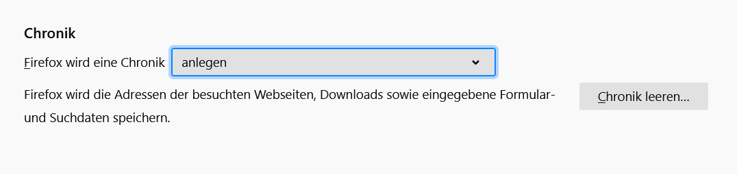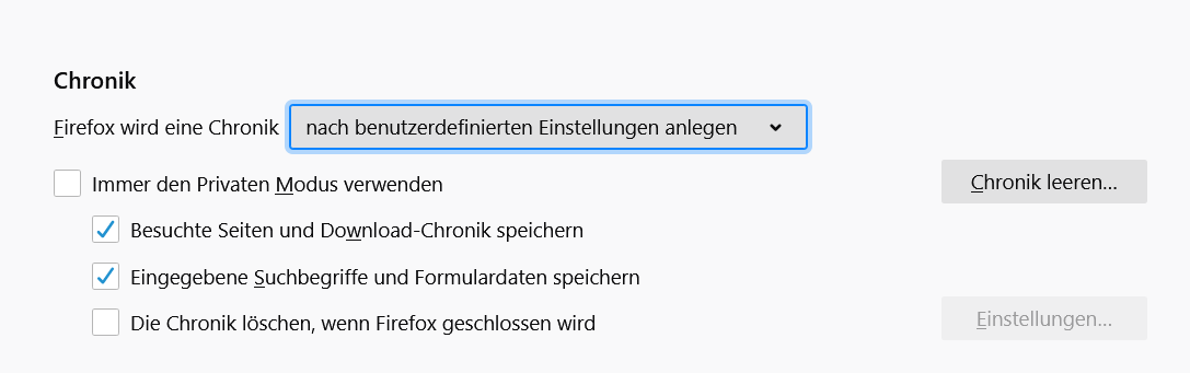 foxtrott2 Stelle mal in den Einstellungen bei Firefox wird eine Chronik statt anlegen nach benutzerdefinierten Einstellungen anlegen ein. Da siehst du dann noch Einstellungen, die wohl grisu2099 in Beitrag #6 meint.