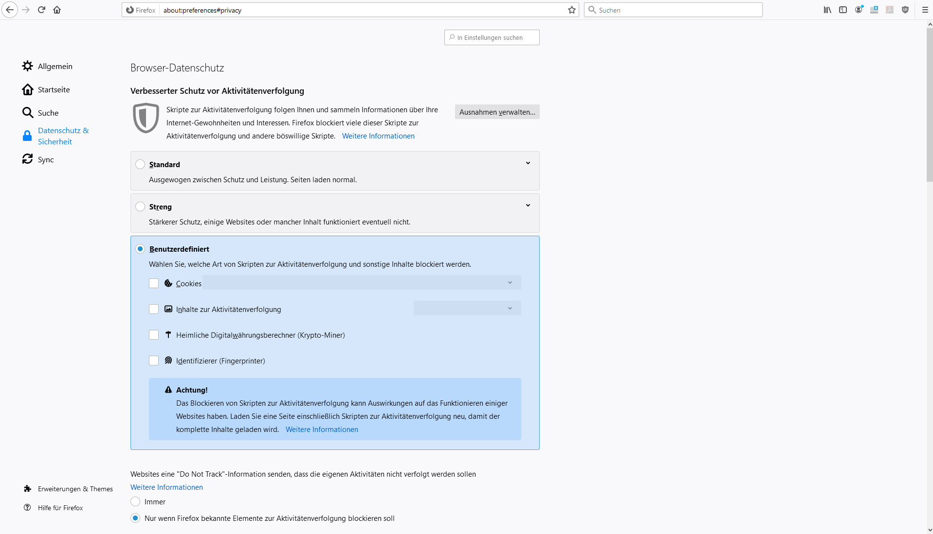 Ich denke, es ist nach alledem besser, den Schutz vor Aktivitätenverfolgung im Firefox benutzerdefiniert zurückzunehmen und das Ganze mit Ghostery zu erledigen.