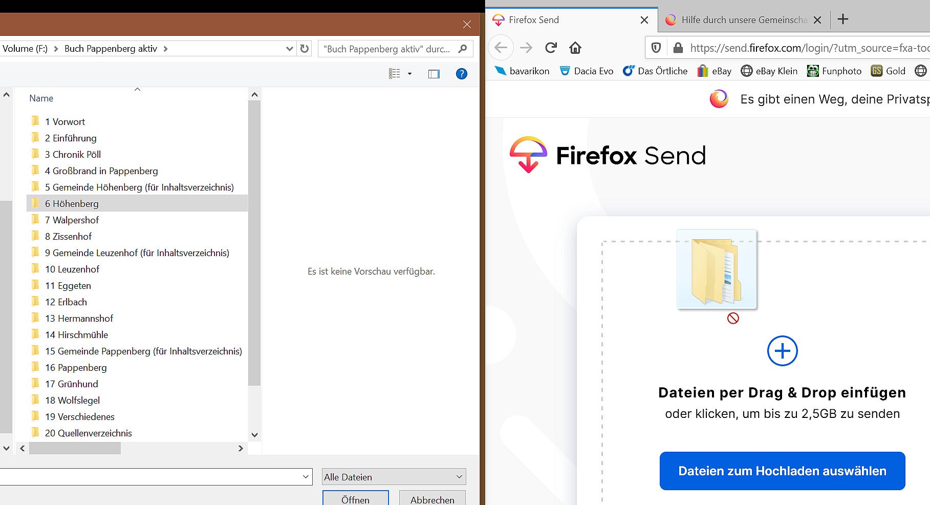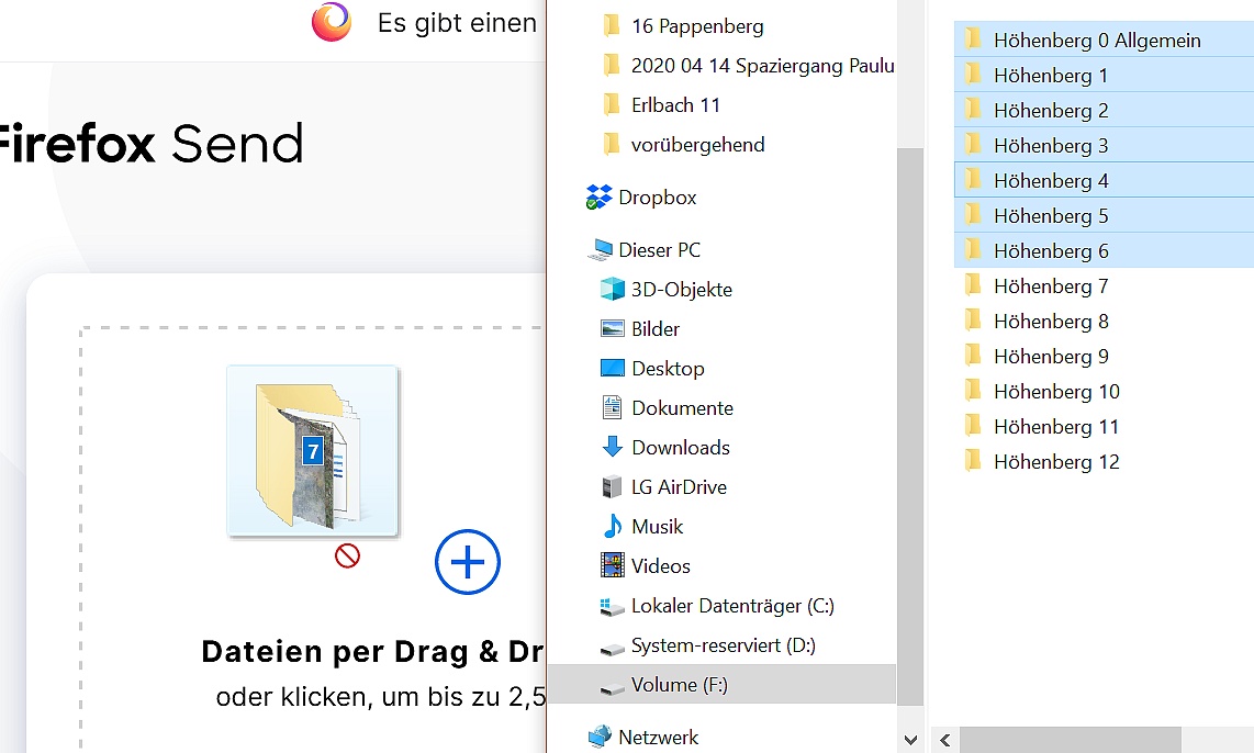 ich würde gerne einige Ordner (max. 200 MB) mit jeweils ca. 150 .doc und .jpg - Dateien über Firefox Send verschicken.