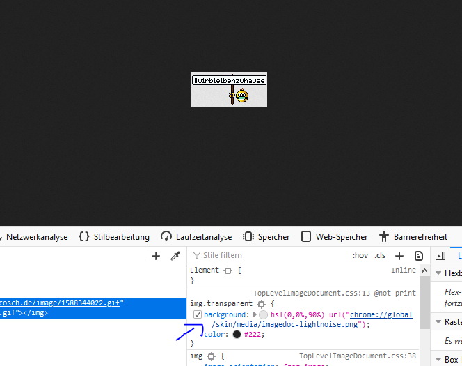 das Gif hat ja eine "Leinwand" also die transparente Pixelgrösse und FF wirft halt da ne Farbe drunter, was mich als Pixler halt stört, da ich dann keine Pixelfehler erkennen kann, ich öffne die dann halt immer im Browser und seh dann die Störpixel, sofern der dunkle Hintergrund da ist .. könnte mir natürlich auch im Grafikprogramm einen dunklen Hintergrund drunter legen, bevor ich das gif speichere, ist aber umständlicher ![]()