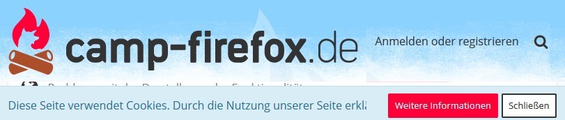 Dann schließe ich Firefox, öffne die camp-Firefox Seite wieder, muss wieder die Cookies-Nutzung bestätigen und die Anmeldung aufrufen