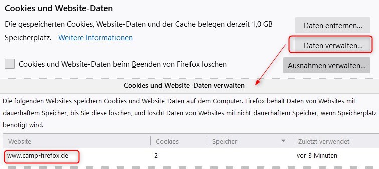 Wenn ich die Anmeldedaten und/oder die benutzerdefinierte Cookies-Behandlung einer Seite speichern möchte, muss ich zunächst über >Cookies und Website-Daten >Daten verwalten prüfen, welche Einträge temporär gespeichert wurden, das können (warum auch immer) bis zu 4 verschiedene Einträge sein. (Cookies und Website-Daten beim Beenden von Firefox löschen ist aktiviert)