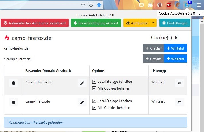 danke dass Du Dich mit meiner Unfähigkeit rumquälst. Bei Cookie Autodelete habe ich bei CampFirefox zwei Einträge, die ich der whitelist zuführe.