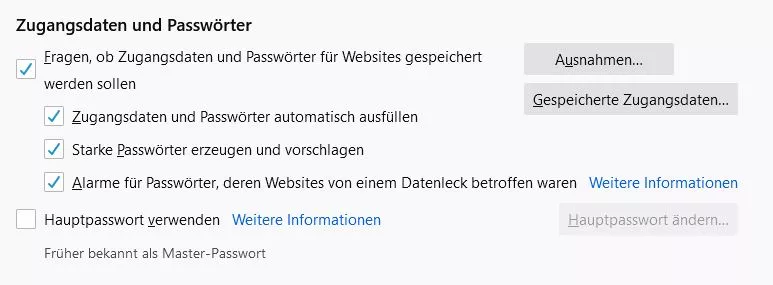 das automatische Ausfüllen von Anmeldefeldern von "FRITZ!NAS"-Verknüpfungen auf Symbolleiste in Firefox funktioniert bei mir nicht, obwohl an den entsprechenden Stellen in den FF-Einstellungen Häkchen gesetzt sind. Ich kann mir zwar in dem Anmeldedialog die gespeicherten Zugangsdaten von Firefox anzeigen lassen und damit befüllen; aber warum werden die beiden Felder für: "Benutzername" und "Kennwort" nicht automatisch befüllt?