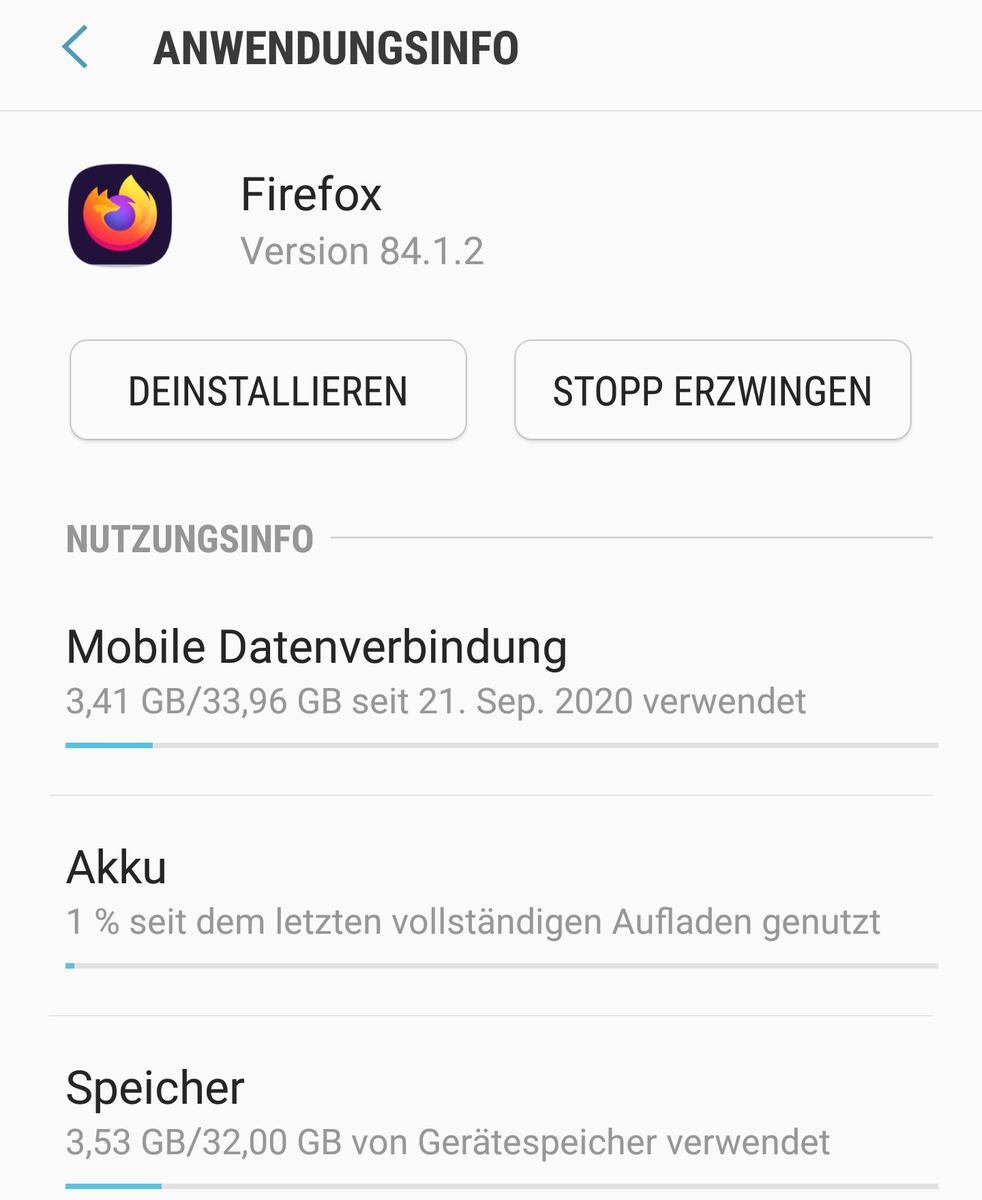 Ich habe sein Samsung Galaxy S6 mit Firefox drauf. Da ich zu wenig Speicherplatz zur Zeit habe, habe ich alle Apps durchforstet um zu sehen, welches App viel braucht.