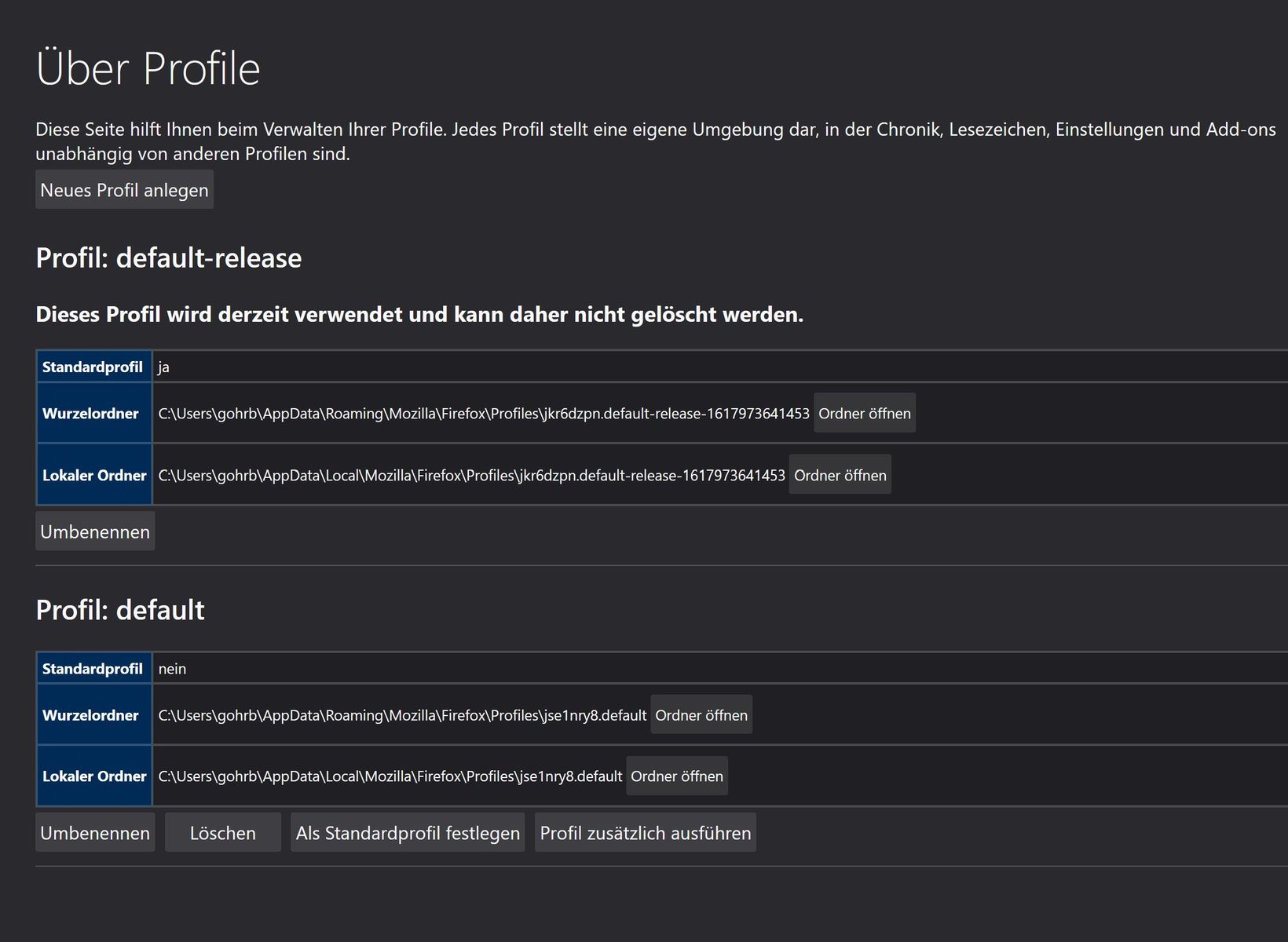 Ich glaube ich habe einen Denkfehler. Wenn ich Firefox deinstalliere, bleiben die Profildaten auf C:\ drauf? Wenn ja, dann muss ich alles aus dem Profil löschen damit es wieder übersichtlich wird. Wenn ich jetzt schaue ist vieles 3 und 4 x drin. Lesezeichen, das Menü einfach alles.