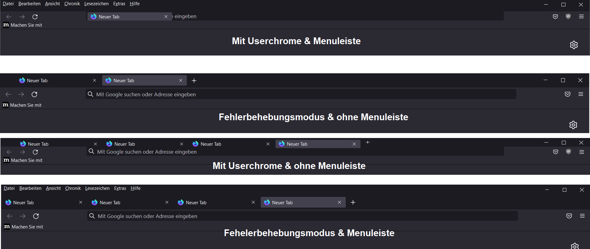 Ja klar, unten angehängt. Wenn die Menuleiste und Userchrome aktiviert sind und ich 10 Tabs offen habe, kann ich den aktiven Tab durch die ganze Leiste bewegen (so als würde ich die Tabposition in der Tableiste ändern). Die Tableiste ist also anscheinend irgendwie da rein gerutscht (ich nutze normalerweise nie die Menuleiste, ist mir daher nie aufgefallen).
