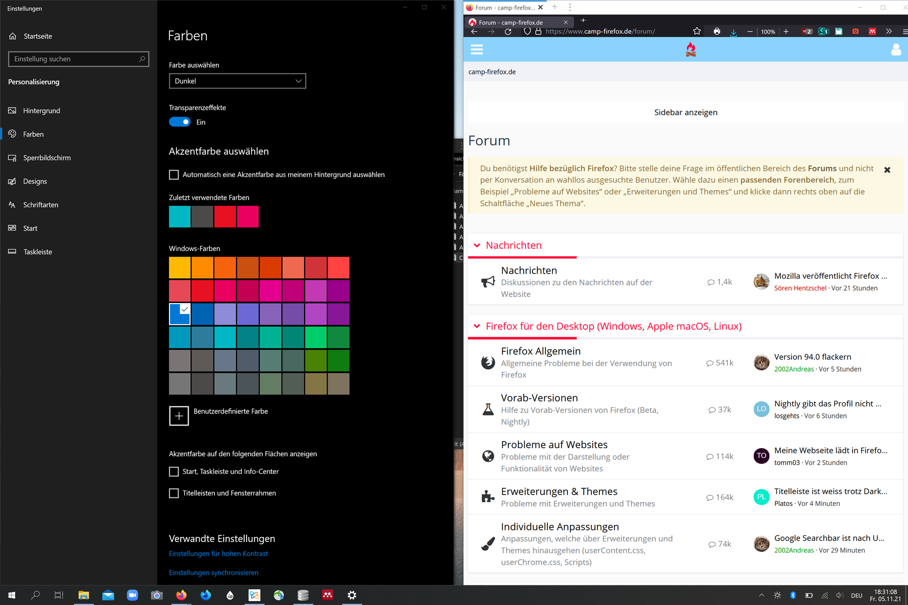 Und ich habe bei beiden Geräten "Farbe Auswählen" ->Dunkel und Transparenzeffekte auf ein.