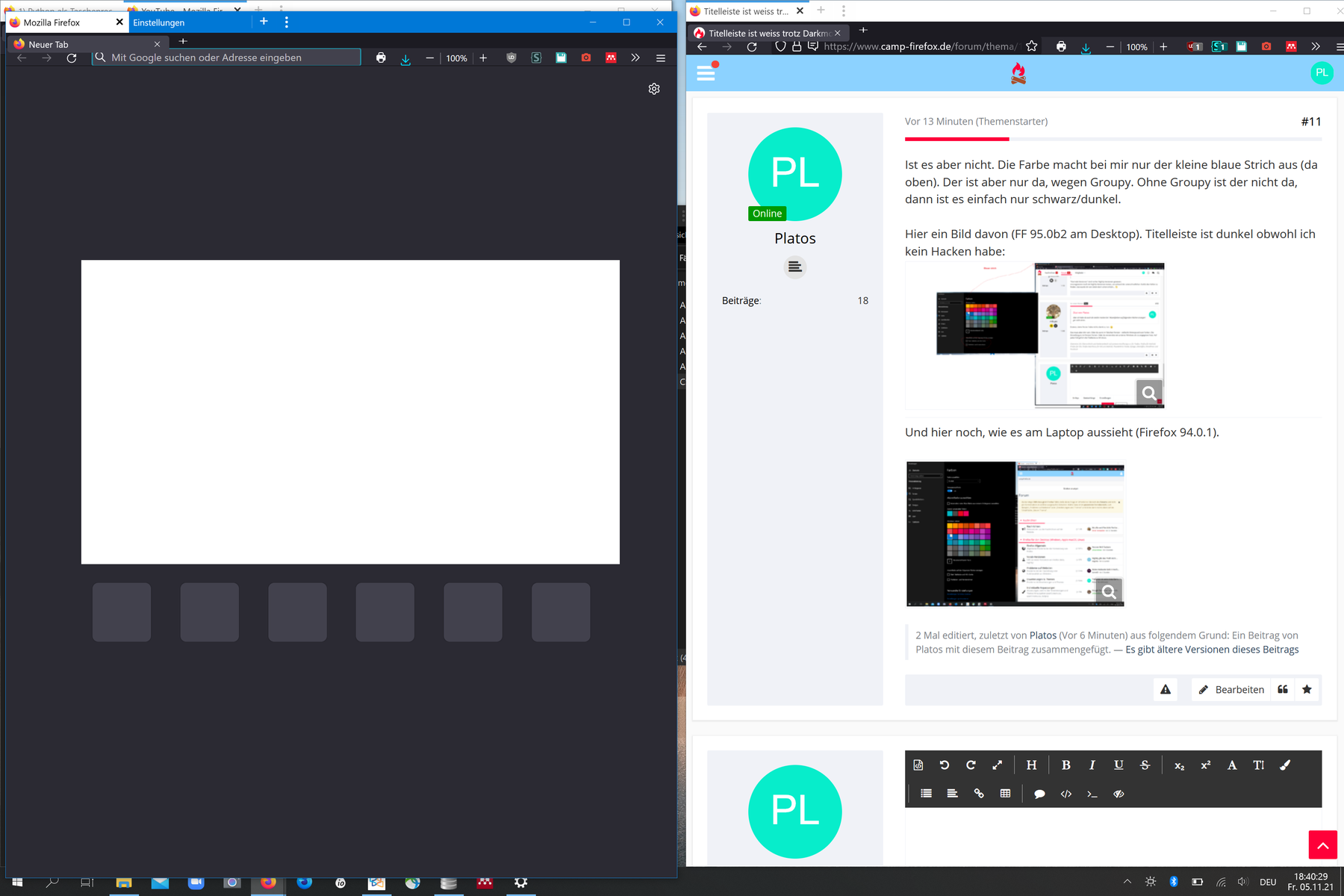 Edit: Die Firefox Developer Edition (95.0b3) liefert hier am Laptop trotzdem eine dunkle Titelleiste (ohne den Haken bei den Farben).