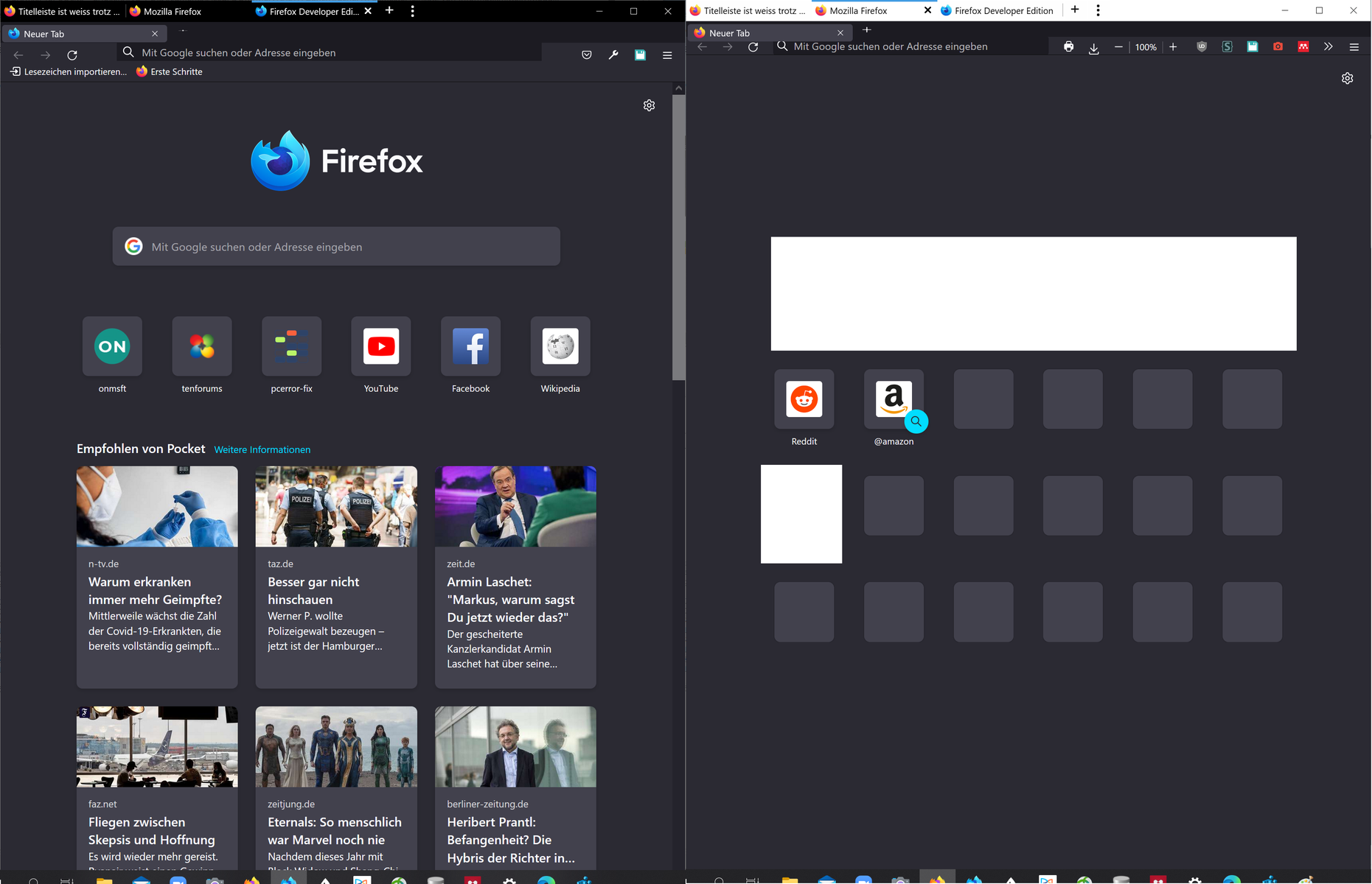 Gut zu illustrieren ist das auch, wenn ich mittels Groupy ein Firefox-94.0.1 Fenster mit einem Firefox-95.0b3 Fenster gruppiere. Siehe das Bild unten. Einmal habe ich die Dev-Edition ausgewählt, dann ist das ganze Fenster dunkel und einmal habe ich 94.0.1 ausgewählt, dann ist alle weiss.