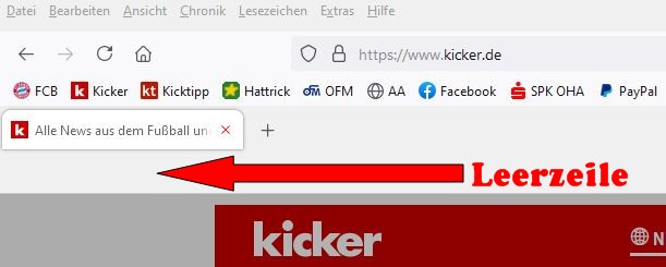 Ich habe mehrere css-Codes ausprobiert, die nach der Umstellung auf FF89 gepostet wurden. Dabei bin ich bei diesem Code hängengeblieben, den ich ans Ende meines Posts gesetzt habe. Die Hauptsache ist schon mal, dass sich die Tabs jetzt wieder unter der Favoritenleiste befinden. Allerdings ist unter den Tabs jetzt eine Art "Leerzeile". Ich habe hier mal einen Screenshot angehängt. Bekommt man die Leerzeile noch irgendwie weg? Und die Tabs wären eckig mit einer dezenten Linienumrandung schöner, statt völlig ohne Abgrenzung. Aber der letzte Punkt wäre eine optische Nebensache. Die unnütze Leerzeile wäre mir wichtiger.