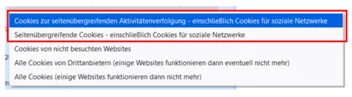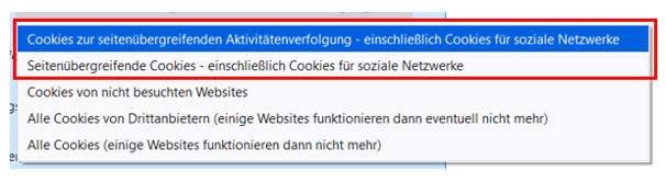 Ich verstehe nicht so ganz was genau der Unterschied zwischen der Option "Cookies zur seitenübergreifenden Aktivitätenverfolgung – einschließlich Cookies für soziale Netzwerke" und "Seitenübergreifende Cookies – einschließlich Cookies für soziale Netzwerke" ist.
