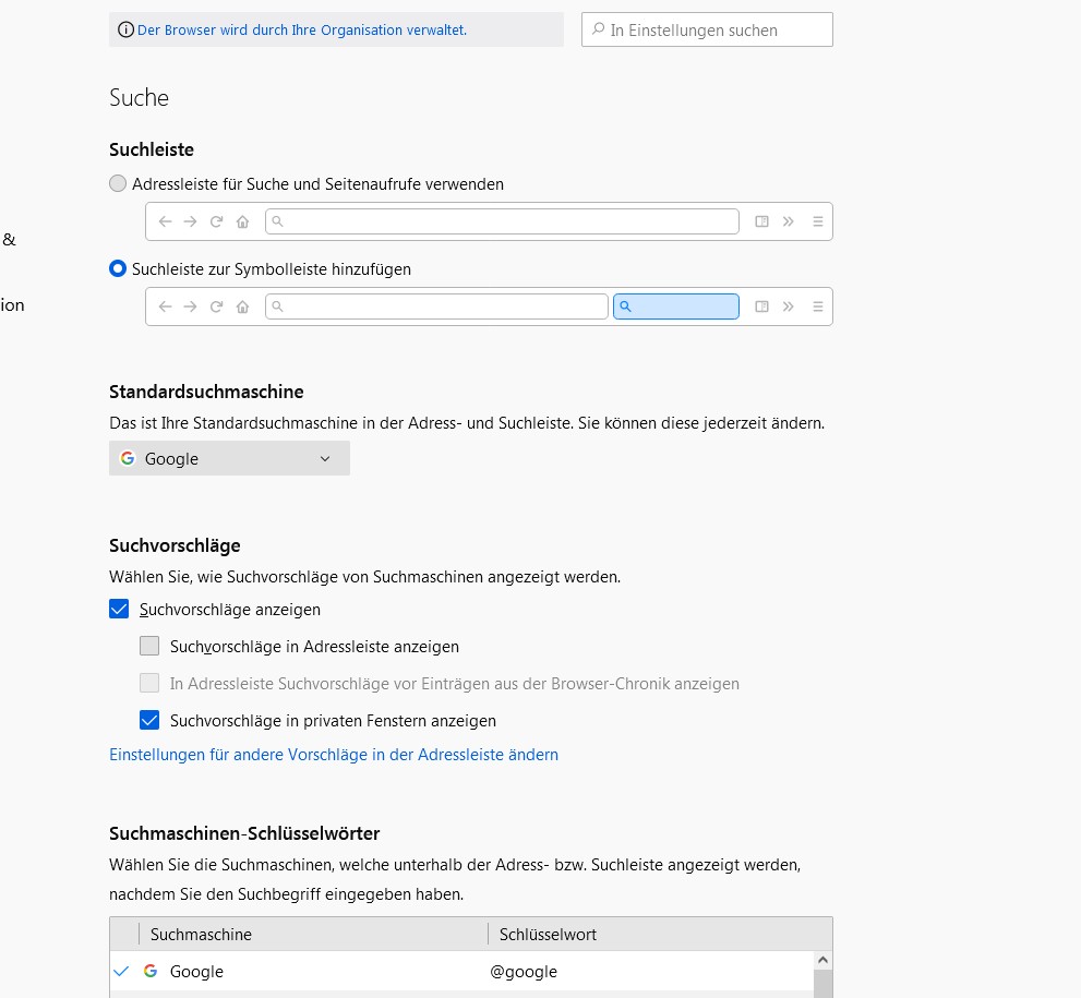 Ich habe auch in den Einstellungen "Adressleiste für Suche und Seitenaufrufe verwenden" rausgenommen.