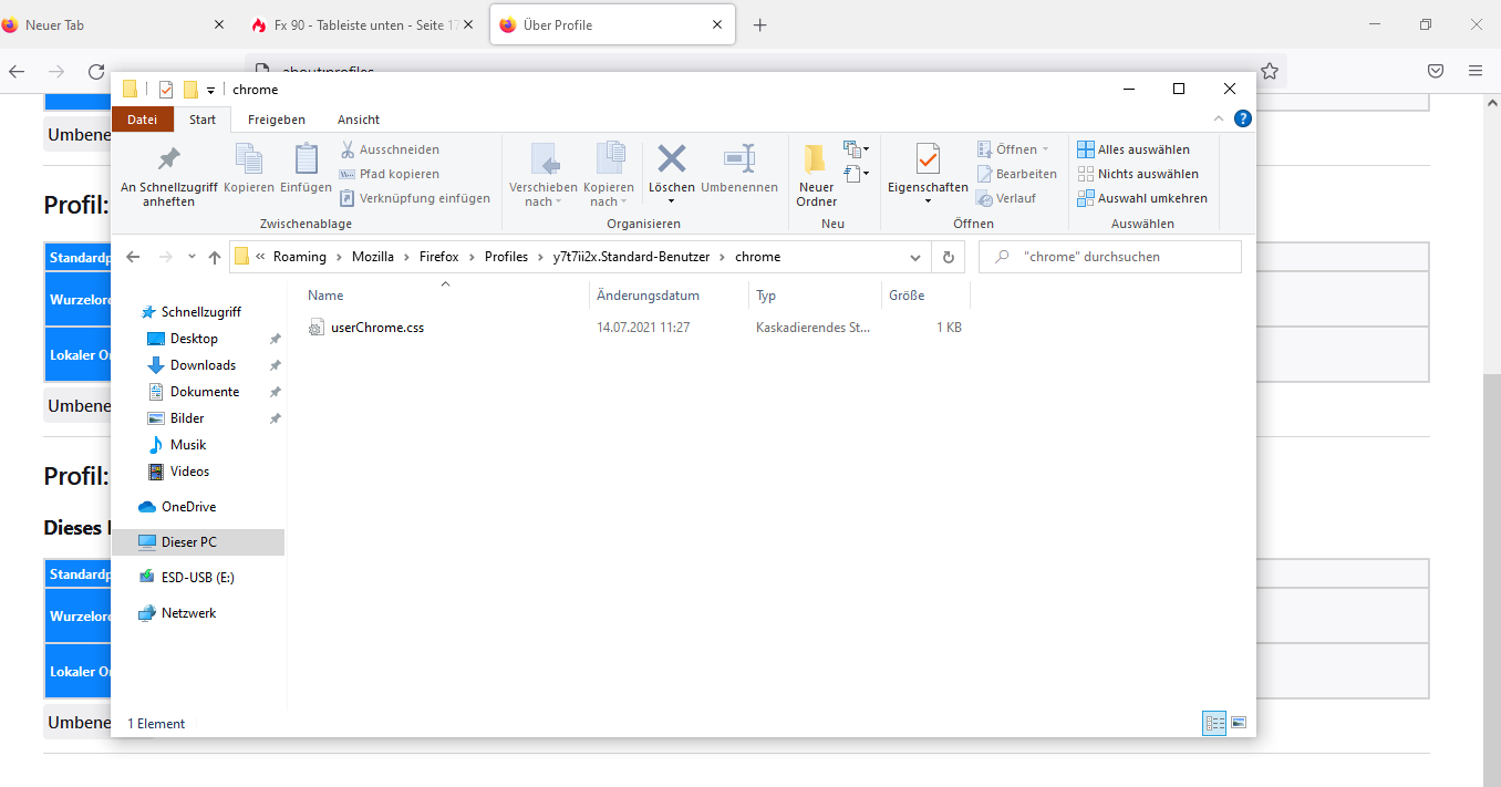 In Beitrag #331 ist das Profil Standard-Benutzer als verwendetes Profil angegeben, in Beitrag #335 das Profil default-release. Das sind zwei verschiedene Profile. Wo ist denn nun deine userChrome.css drin?