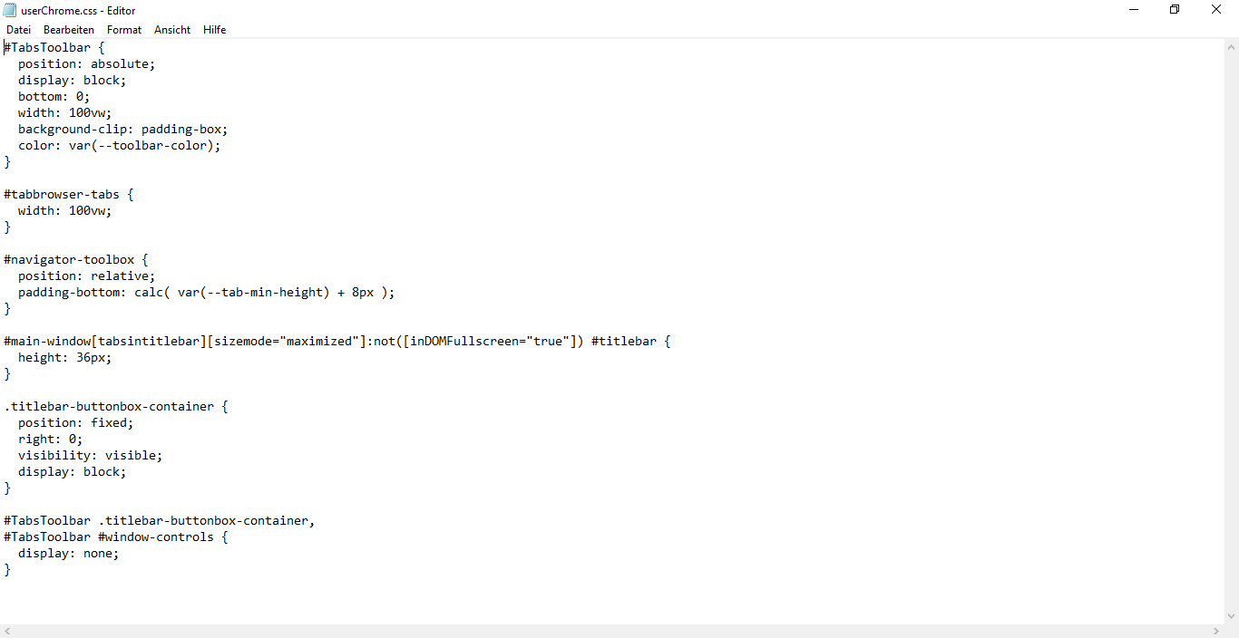 Ich bin über about:config zum Standardprofil dort zum Wurzelordner und habe im Ordner chrome die css Datei geöffnet und einen Screenshot gemacht.
