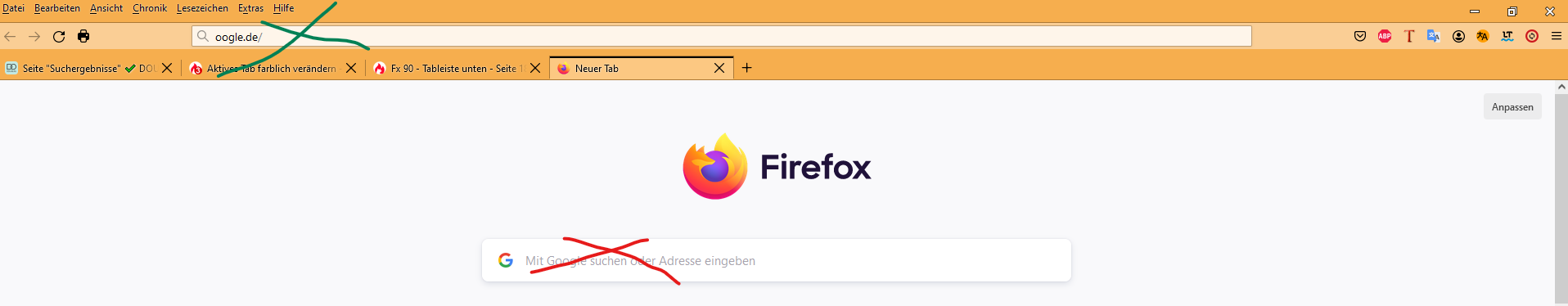 Was aber anders ist jetzt nach dem Update, wenn ich meinen Text dort eingeben will, wo das rote Kreuz ist, geht das nicht. Ich hüpfe sofort in die Adressleiste wo das grüne Kreuz ist. Wo stelle ich das um?