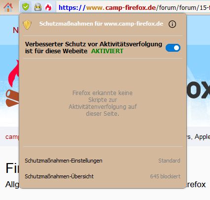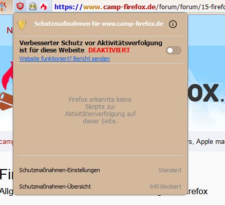 Alles anzeigen/*Schutzmaßnahmen PopUp Text Aktiviert und Deaktiviert Farbe ändern*/ [data-l10n-id="protections-panel-etp-on-header"] { font-size: 0px !important; height: 20px !important; } [data-l10n-id="protections-panel-etp-on-header"]::before { content: "Verbesserter Schutz vor Aktivitätsverfolgung ist für diese Webeite " !important; font-size: 12px !important; } #protections-popup-tp-switch-section > vbox:nth-child(1) > label:nth-child(1)::after{ content: " AKTIVIERT " !important; color: green !important; font-size: 12px !important; } [data-l10n-id="protections-panel-etp-off-header"] { font-size: 0px !important; height: 20px !important; } [data-l10n-id="protections-panel-etp-off-header"]::before { content: "Verbesserter Schutz vor Aktivitätsverfolgung ist für diese Webeite " !important; font-size: 12px !important; } #protections-popup-tp-switch-section > vbox:nth-child(1) > label:nth-child(2)::after{ content: " DEAKTIVIERT " !important; color: red !important; font-size: 12px !important; }Hab es in 2 verschiedenen Firefox Versionen getestet und klappt bei BEIDEN !