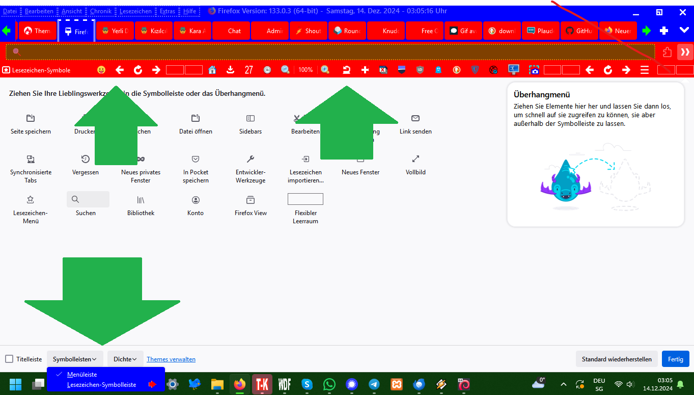 Wie ihr im ersten Screenshot sieht, sind meine beiden vertikalen Zusatzleisten seid einiger Zeit beide auf der linken Seiten, obwohl ich vorher das Eine auf der rechten Seite hatte. Ich kann die leider auch im "Symbolleiste-Anpassen-Fenster" nicht mehr sehen (siehe zweiten Screenshot).