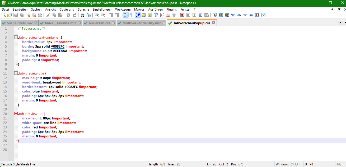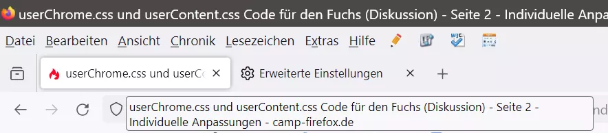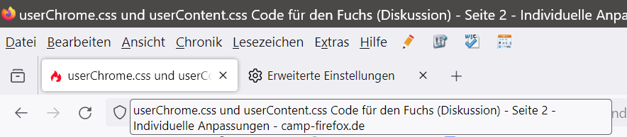CSS Alles anzeigen/* Tabvorschau */ .tab-preview-text-container { border-radius: 3px !important; border: 3px solid #0082FC !important; background-color: #EEE8AA !important; margin: 0 !important; padding: 0 !important; } .tab-preview-title { max-height: 80px !important; word-break: break-word !important; border-bottom: 1px solid #0082FC !important; color: blue !important; padding: 6px 8px 8px 8px !important; margin: 0 !important; } .tab-preview-uri { max-height: 80px !important; white-space: pre-line !important; color: red !important; padding: 6px 8px 8px 8px !important; margin: 0 !important; }