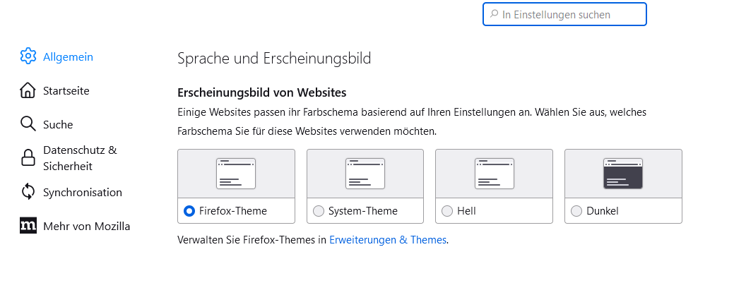 Ok also sind also unterschiedliche Einstellungen wenn man direkt in die Einstellungen geht dann nur die Websites und geht man auf Add-ons und Themes dann gehts um die gesamte Browser Optik. Danke.