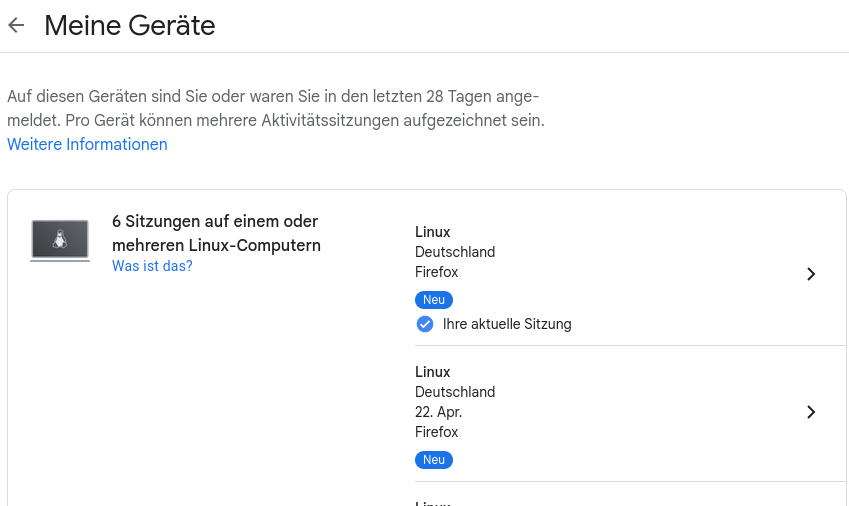 Ich habe eine Frage zu Cookies. Wenn ich mich hier(Debian Stable) mit dem Firefox 112.0.1 (Flatpak) in Gmail-Konten anmelde, danach abmelde ggf. auch die Cookies lösche, dann wird mir in den Google Konto-Einstellungen(Sicherheit / Meine Geräte) die letzte Anmeldung als noch angemeldet angezeigt.