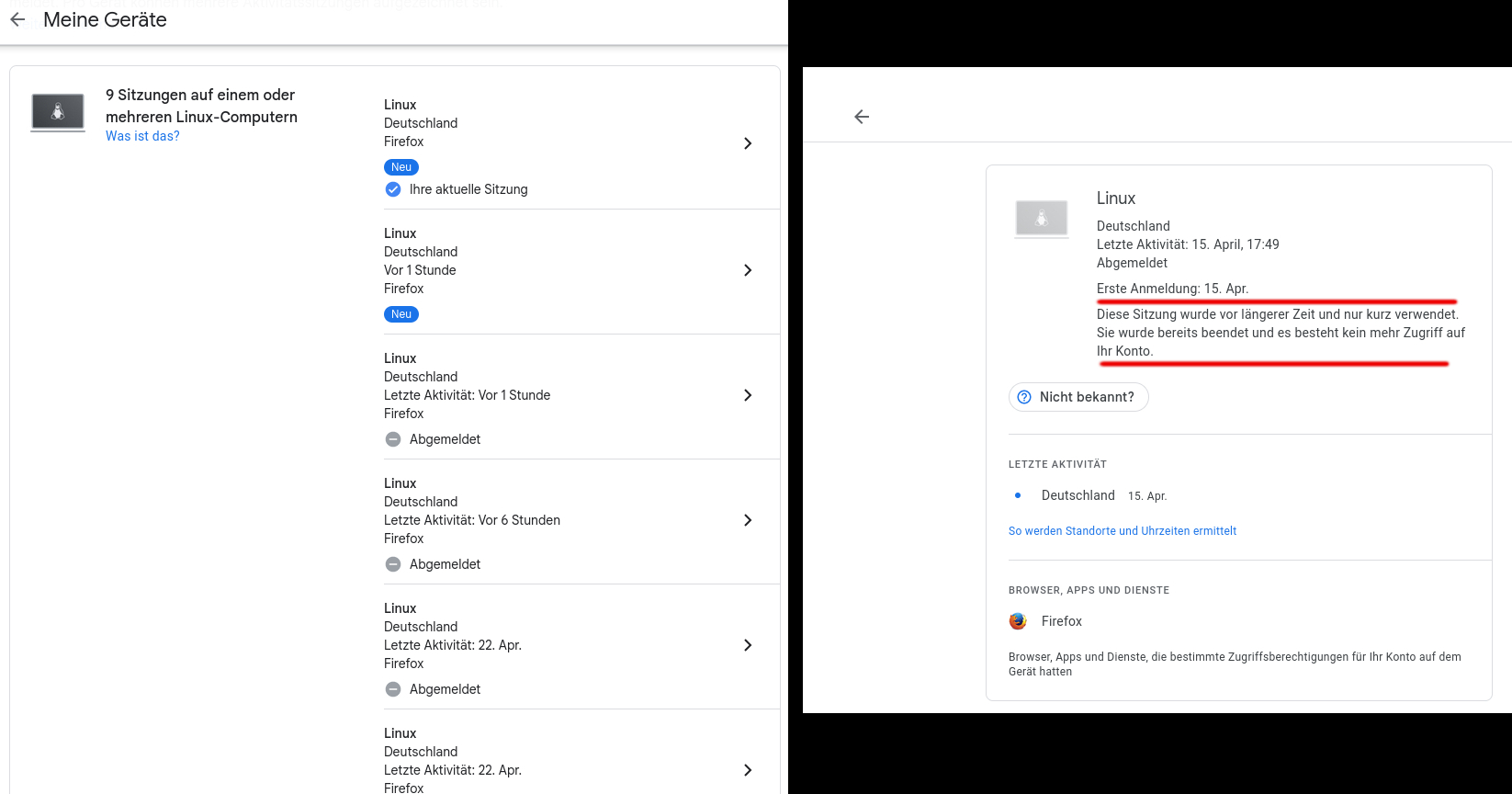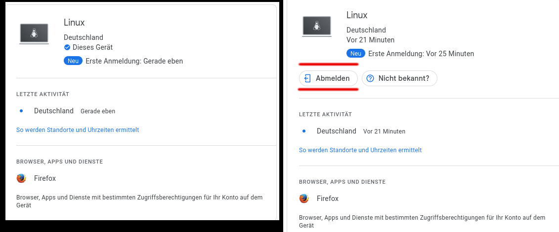 Ich habe ein Bilschirmfoto zusammengeschnitten. Die linke Seite davon zeigt die aktuell angemeldet Sitzung, die andere Seite zeigt die Sitzung von der ich mich abgemeldet habe. Diese Sitzung wird aber nachdem ich mit wieder eingeloggt habe, als nicht abgemeldet angezeigt. Ich kann mich von der schon abgemeldeten Sitzung nochmals abmelden.