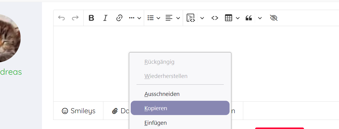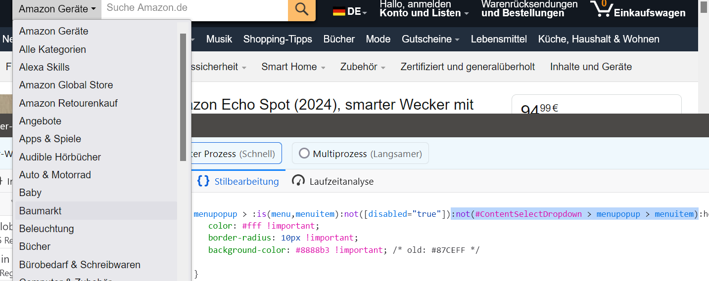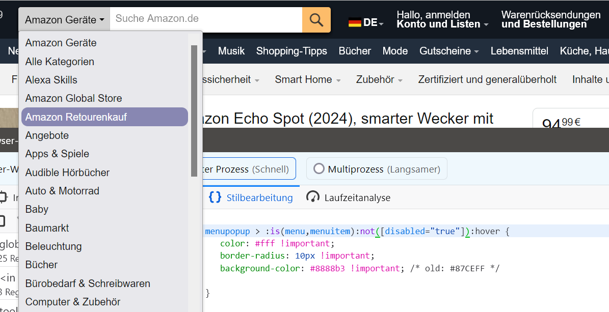 CSS Alles anzeigen/*4. hover Farbe in allen pop-up menüs ändern*/ @-moz-document url-prefix("chrome://browser/content/browser.xhtml") { menupopup > menu[open]:not(focus){ background: #8888b3 !important; color: white !important; border-radius: 9px !important; } menupopup > :is(menu,menuitem)[disabled="true"]:not(#ContentSelectDropdown > menupopup > menuitem):hover { color: white !important; border-radius: 9px !important; background-color: #2b2c86 !important; /* old: #87CEFF */ } menupopup > :is(menu,menuitem):not([disabled="true"]):not(#ContentSelectDropdown > menupopup > menuitem):hover { color: #fff !important; border-radius: 10px !important; background-color: #8888b3 !important; /* old: #87CEFF */ } }Zeile 4 - 8 sind neu.