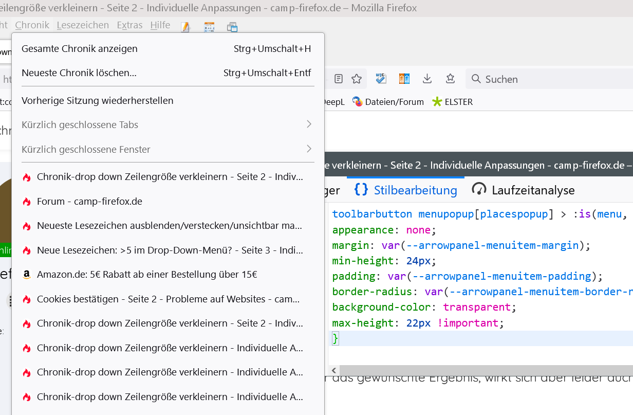 hat jemand einen Code, mit dem man den Abstand der Zeilen im Chronik-drop down verkleinern kann? Bisher hatte ich da einen Code, der sich auf alles ausgewirkt hat. Da dadurch im neuen Erweiterungsmenü Text abgeschnitten wird, habe ich in einem anderen Thema schon eine Anpassung für das Hamburger Menü erhalten. Jetzt benötige ich etwas, was sich nur auf dieses Chronik-drop down auswirkt.